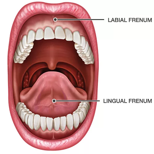 In the mouth, a frenum/frenulum is a band of tissue that connects the tongue to the floor of the mouth or lower jaw (lingual frenum) and the lips to the gums (maxillary labial frenum). Everybody has these bands of tissue and in many cases, they are completely normal and require no intervention.